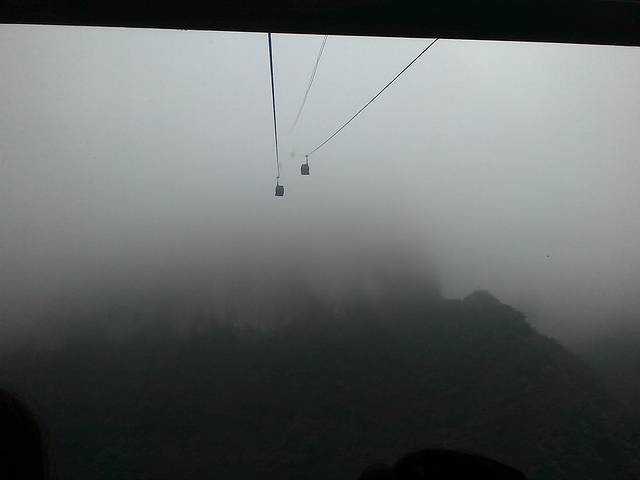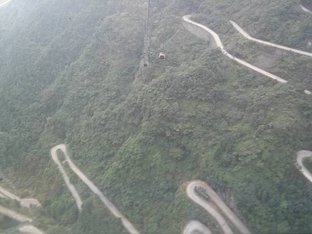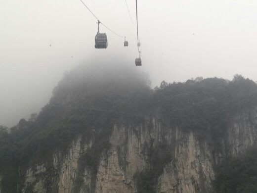 (1)早上先是乘坐大缆车上山:天门山索道是全亚洲最长的索道,全程要半个小时左右,速度还挺快,爬过每座山都是又急又陡又快的冲上去冲下来,特别刺激。快到山顶时,云海雾海又出现了,四周都是白茫茫的,只看见上面的缆车从天而降,感觉。。。到天堂了吧,这么美。