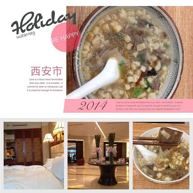 从咸阳机场到西安市区赶上雨了,打不着出租车,还好大巴很多,线路也指示的非常清楚,26元一位到市区。还是打不着出租车,乘上一辆摩的20元到酒店,很近,下雨也没砍价。酒店很大,是花园式的,摆渡把我们送到大堂门口,入住稍事休息,已近中午,虽在飞机上吃了可还是期待去回民街。打了一辆出租车去回民街,和司机把第二天兵马俑、华清池的行程订好,300元往返,崭新的福特私家车,回民街白,,呵呵。回民街的确有当地浓郁的色彩,虽然也商业化了,但毕竟是老房子、老街道。把回民街走完就是鼓楼,由鼓楼向北大概两站地,就到了古城墙,门票54元。下了城墙累了看见公交车往南开就上了,反正1元坐了3站觉得差不多下车,溜达半站地穿过地下通道,到了钟楼,有个下沉式广场,一边是古香古气的钟楼,一边是硕大的星巴克和Dior的展台,你不觉得恍惚吗?第二天的兵马俑更是穿越之旅,门票150元,含黄帝陵。参观完后只能感叹古人的智慧。不跟团是明智之举,不受时间约束,不用去购物。你都猜不到兵马俑跟团的带你去买和田玉,满街假玉。黄帝陵实在是太大了,有78个故宫、25个澳门那么大,15元一位坐摆渡车用半个小时逛了一圈。华清池没有特别吸引人的地方,只是杨贵妃出浴的地方,所以名声在外。到了就去呗。下午3点半到酒店,太累了。睡了一大觉,起来找吃的,酒店保安把我们指错了地方,还是用手机导航找到了正宗的西安饭庄。其实我就一吃货......雨一直下,大雁塔的喷泉看不到了,第三天上午去的,大雁塔有南北广场,我们从南广场慢慢开始逛,有各种雕塑,大雁塔在广场正中心,大家仔细看的话,会发现塔是倾斜的。打车回到酒店就中午了,到李志明腊汁牛羊肉店买了腊汁牛肉、腊汁羊肉、酱羊肉,还有馍。本想和大家分享,怎奈我家大小3只食肉动物,还好在机场买了些特产小小的分享了一下。