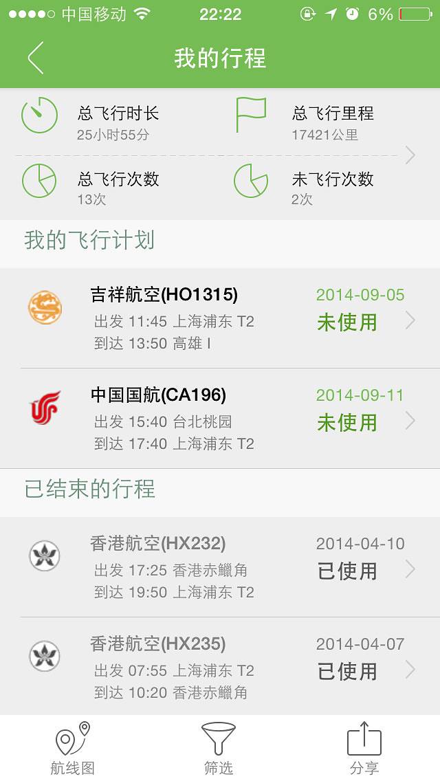 手机APP“航旅纵横”很好用,只要把你的护照、身份证、港澳通行证、台湾通行证号码填上,只要你订机票就会自动显示,还会提示延误取消换登机口等信息