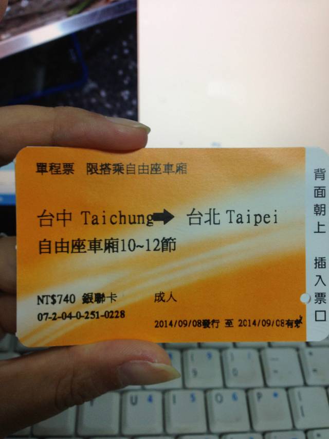早上睡到自然醒- -!老公不肯早起没办法,还好今天行程不多,整理了行李,退了房打了个车到台中高铁站,买了台中-台北的车票,然后买了铁路便当,有红烧大排,鸡腿,鸭腿,挺好的,味道也不错呢,上了车开吃,可能正逢中秋,台中到台北没买到座位票,只有自由票,就是车上有2节车厢是自由车厢没固定座位的,有位置就坐,还好台湾人都很有素质呐,爸爸妈妈带baby的,都把baby放自己身上把位置让出来,赞一个岛民素质呐!~