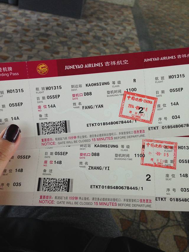 吉祥航空HO1315 上海浦东11::45--高雄13:50 2200元/2人含税