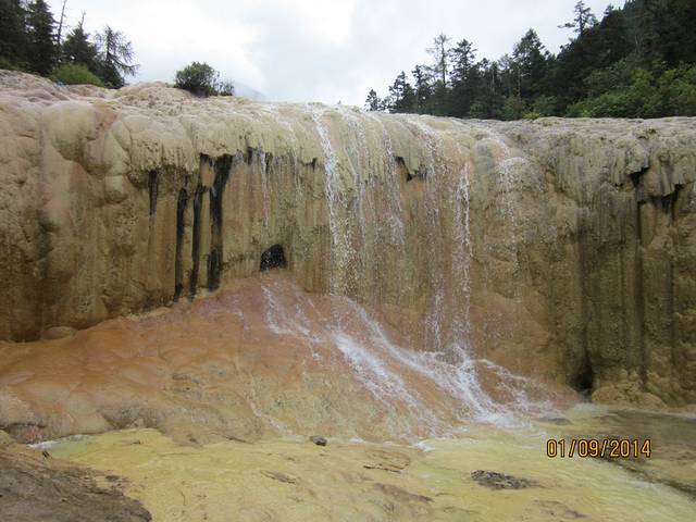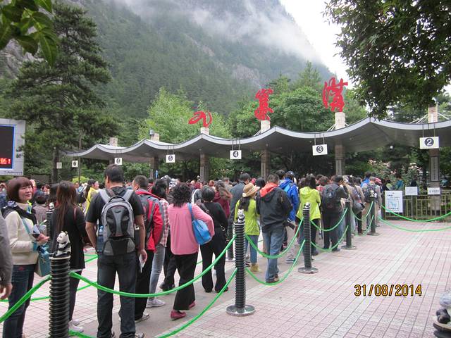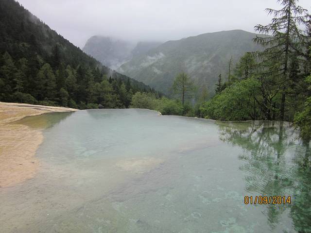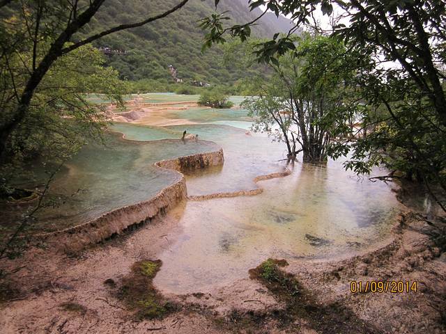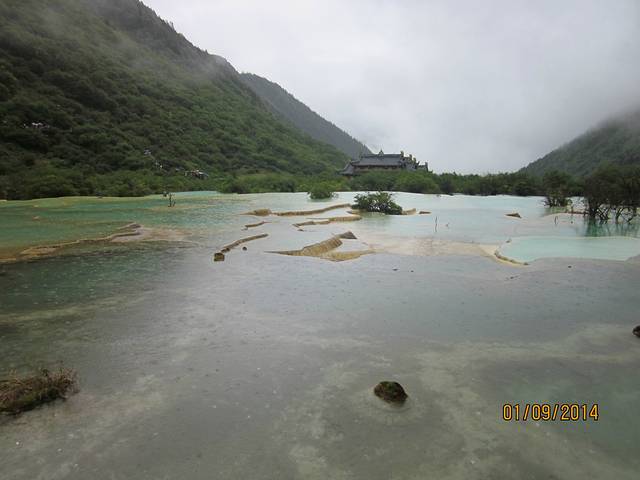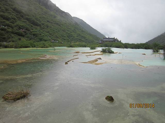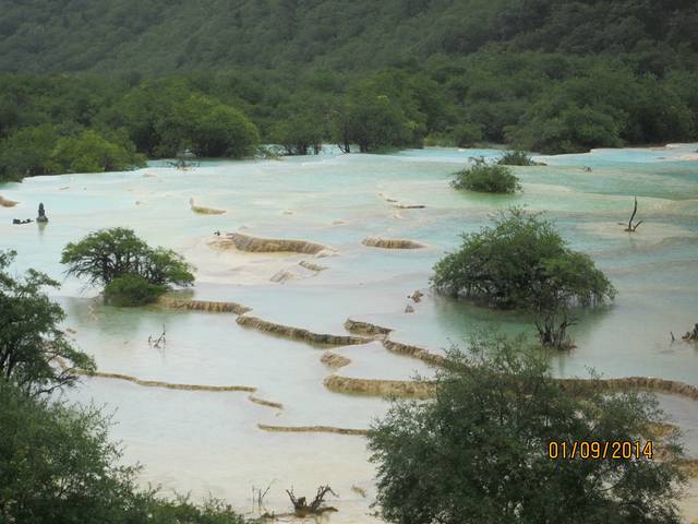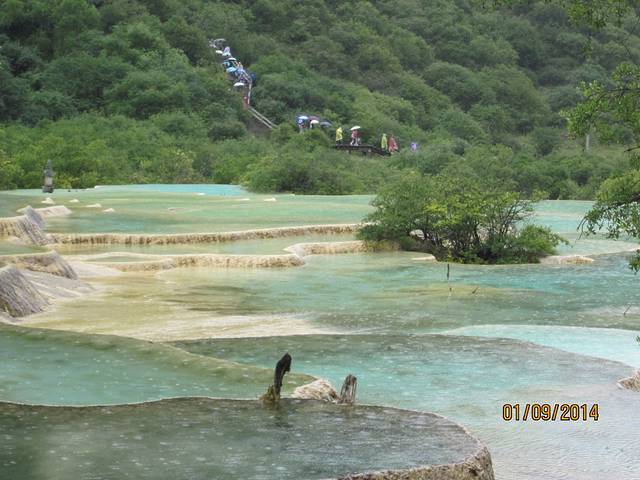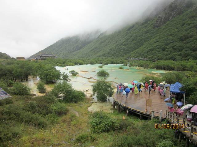 吃完早饭开始前往黄龙,一路上要经过海拔4021米的雪山梁,约一个小时到达景区大门,乘索道上山,然后向下走,黄龙五彩池位于最高处,下索道后还要走半个多小时,坑爹。其实黄龙的山顶就是岷山的主峰雪宝顶,水量丰沛加上钙化造就了黄龙这一世界奇观。