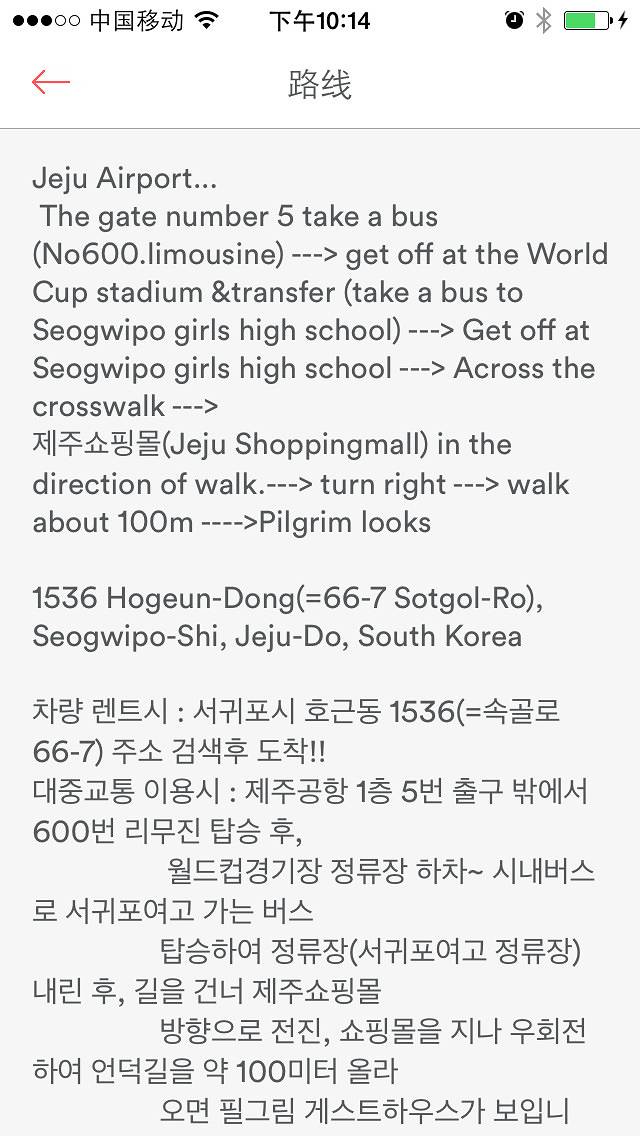 到了机场,我找到600路后,就前往西归浦市的旅馆,(根据房东事先提供的路线),大概一个多小时候,到了西归浦市的e-mart,需要在这边转车,但我正好还没吃午餐,于是就在里面解决了。饱餐一顿之后,在公交车站寻觅要做的车,可是都是韩文,问了一些公交车司机,他们也说不到,那我只能taxi,还好不是很远,司机先生很友好,少收了我钱,还跨我漂亮(不好意思了),顺利抵达旅馆!