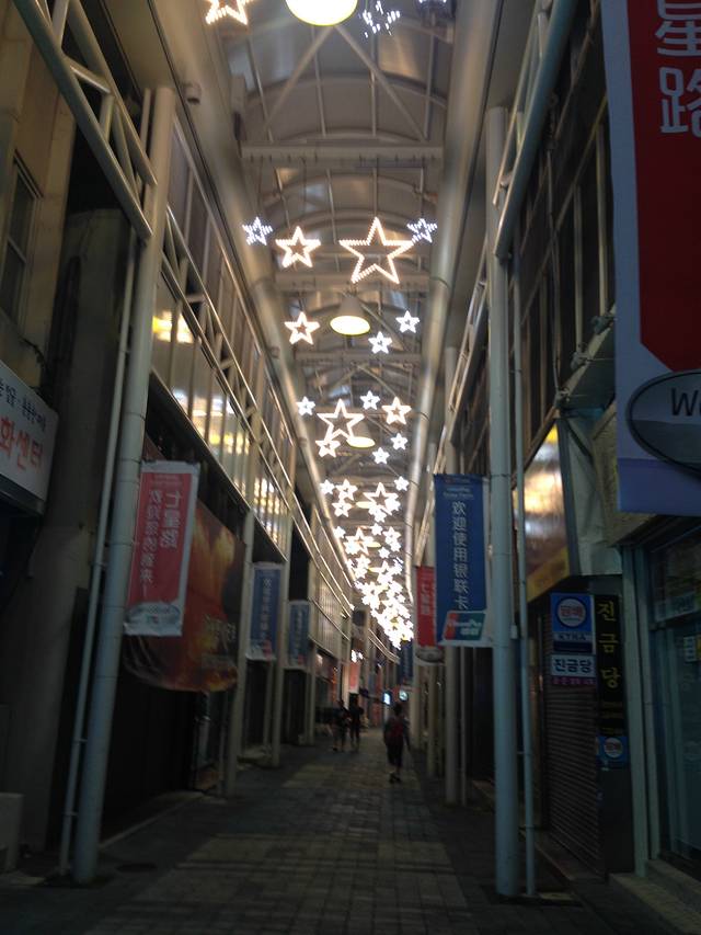 晚上去附近的中央地下商城街去看看,是步行过去的,因为“济州岛离线地图”可以定位你所在的位置和地下商城街的位置,所以边看边走。挺有意思的,晚上一个人拉的箱子独自走在异国他乡的街上,此时此刻,正享受的一个人旅行的滋味,感觉真好。刚进中央底下商城街感觉有点像七浦路,里面有卖服饰、化妆品等,我看了宝宝的衣服质量不好,而且价格也不便宜,还让人感觉是七浦路进的货,哈哈。去化妆品专柜看看,发现那边的化妆品比卖场便宜不少,果断把该买的一些都买了,还有一些那边没有专柜,所以没买到,有悦诗风吟、It's skin、The Face Shop等等专柜。等买完时间也不早了。回Guest house。