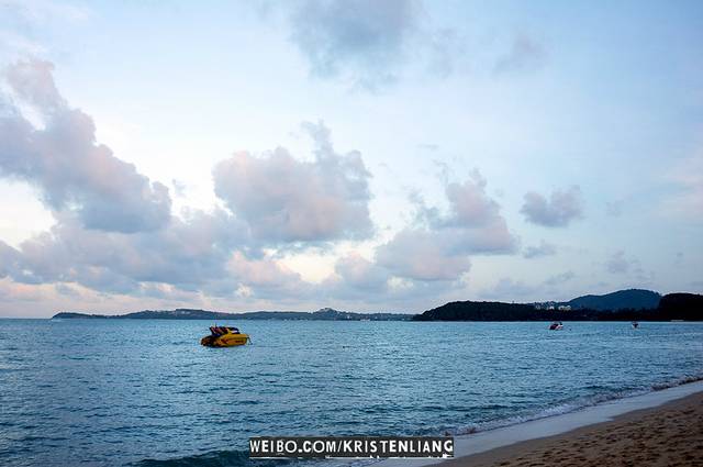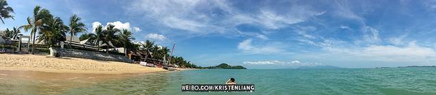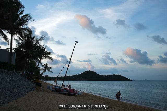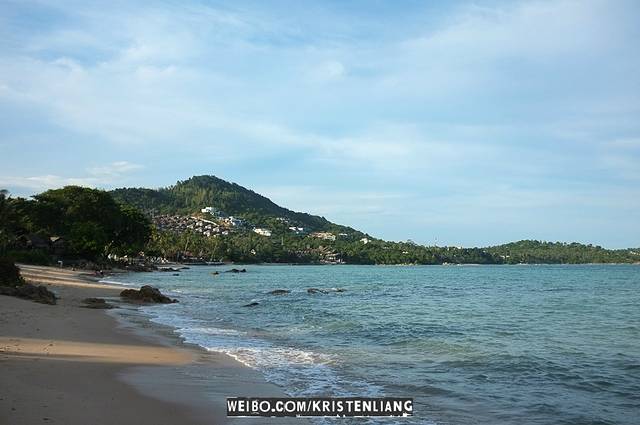 酒店在 Bophut Beach 波普海灘,蘇梅島的北邊,是個並不怎麼熱鬧的地方,偶有有個當地人走過兜售紀念品、泳衣、飲料雪糕。這個海灘連漲退潮都幾乎沒有浪,大多數人都是在看書曬太陽的。而且沙質並沒有很好,感覺像人造沙。最大的有點就是靠近機場(15分鐘)和Fisherman's Village(5分鐘)。