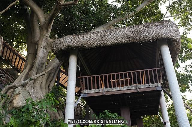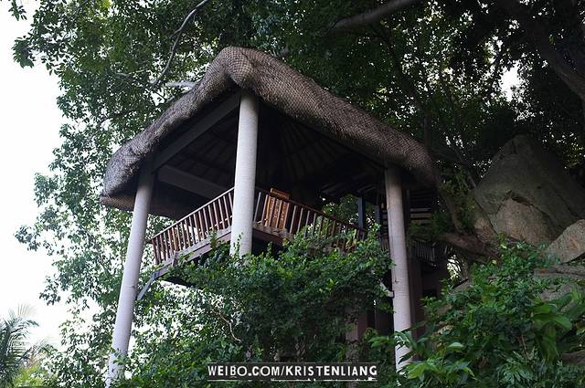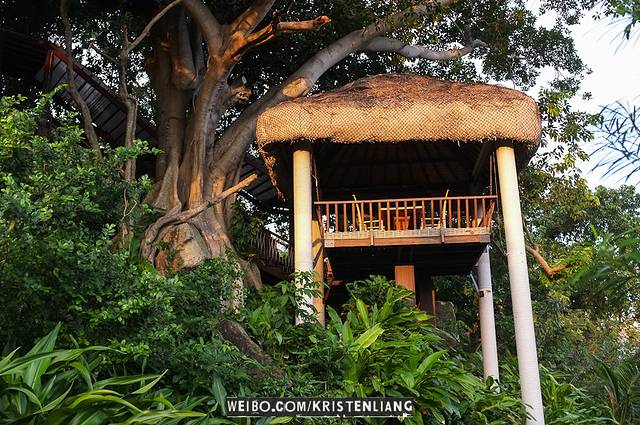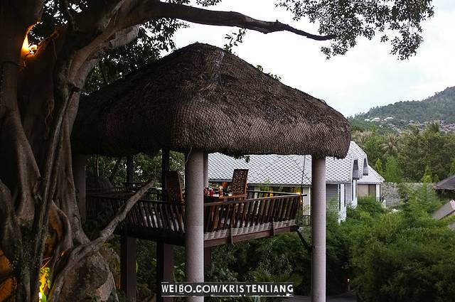 蘇梅島 Tree Tops 樹頂餐廳 | 這家在Anantara Lawana酒店裡面的餐廳,有七間從地面到懸在半空的涼亭。其實位置最高的那間涼亭也不過勉強看到泰國灣(如圖),高度比想中要低,而且六點才開始開放晚餐,沒多久就天黑了。價格有點過高,食物卻一般般,但每人都送了一份鴨胸和馬卡隆。純粹吃氣氛~