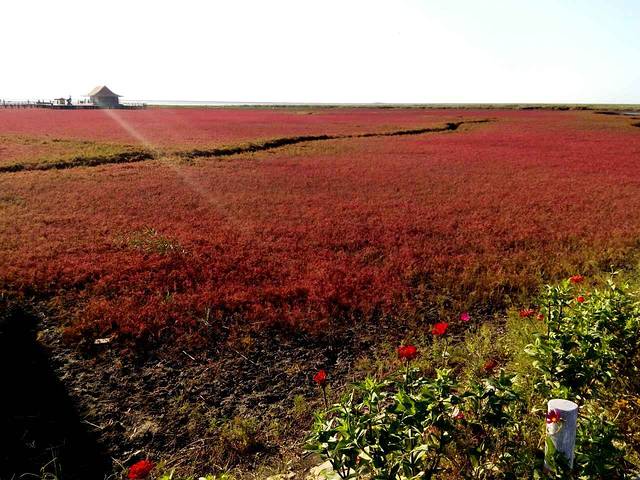 碱蓬草,成就红海滩的 一种特殊稀有的软体植物,它们不喜欢孤独,而是相依相偎,缠绵成片的生长在海边盐碱滩塗中。每年4-6月发芽,初长出地面是绿色中带点泛泛的粉嫩红,7-8月开花,植物体逐渐变为红色,9-10月结果,红色更为灿烂妖艳,也是最佳观赏期。