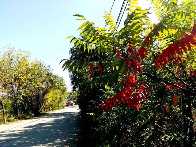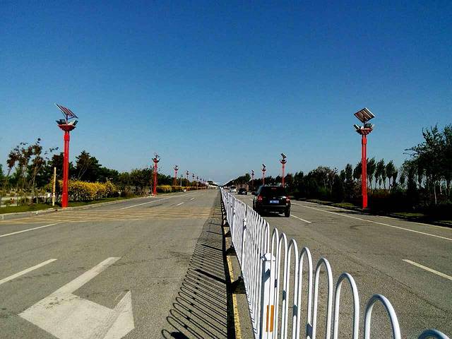 这趟中巴路线走的是乡间小马路,一路上满目北方秋季景色,蓝蓝的天空,朵朵白云悠闲漂移,微风徐徐,吹的小河边浓密高大的芦苇不停的、整齐划一的点头哈腰,像是在迎送每一个过客,河的上空还有不少白鸥飞翔觅食,远处大片稻田里还有没收割的黄褐色稻谷在阳光下金灿灿的闪着光,还有那些白色的风力发电机缓缓转着,暗红色的采油机不紧不慢的磕着头,北方农家小院屋前房后种满了波斯菊、美人蕉,或红艳,或艳黄,或纯白,或淡粉,或淡紫,一切都是那么安逸祥和......车窗外片片树绿不停掠过,使人心情大好,很快就到了景区大门口。