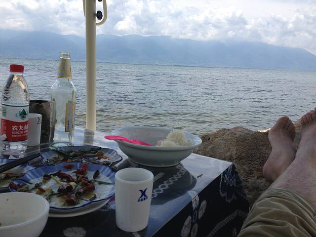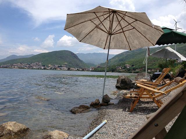 早在网上查找双廊的旅店,就发现有很多,其中以半岛63号尤为著名,想预订才发现,果然火爆,都排在了三个月后,好吧,退而求其次,在去哪儿上预订了依水云居客栈,450一晚的价格,怎么说呢,谁让这是旅游区呢,还好比较清静,晚上和女友光着脚丫坐在阳台的躺椅上,吃着买来的新鲜水果,听着脚下洱海的阵阵海浪声,看着远处苍山的模糊轮廓,还是挺浪漫的。当然,在双廊不得不提的就是,骑车环海了,租车很便宜,一辆捷安特20元,不限时间,还有好多租摩托车的,下次有机会也想体验一下,可惜之前没有做足准备,女友只涂了少量的防晒霜,而笔者则根本没涂,结果就是,两个小时的骑行,裸露部位彻底被晒伤,所以在此提醒大家,一定要涂好防晒霜。在骑行旅途中,最舒服的就是找一处洱海边的农家餐馆,然后点几道小菜和啤酒,坐在躺椅上放松,可以把鞋脱了光脚丫伸进海水中,看着远处苍山雾霭朦朦,心情大爽,还记得那边的啤酒叫风花雪月,味道属于清香型,值得品尝。PS:公路旁农家乐不是很贵,没有菜单,选择新鲜食材,主人烹饪,素菜20,荤菜40,量比较大。玉矶岛上有杨丽萍行宫,十分豪华,可以去看看,附近还有一个名族风情园,里面有人造沙滩,可以游泳。晚上夜市很多,可以逛逛,临近海边有烧烤啤酒摊,比较干净,可以一去,特色菜有凉拌树皮、酸鱼、烤饵块、米线等云南特色菜。