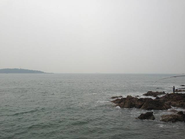 蓝天白云和大海。小青岛前是作为海军的一个哨所,现在变成了青岛的海军博物馆。与小青岛隔海相望的就是栈桥。
