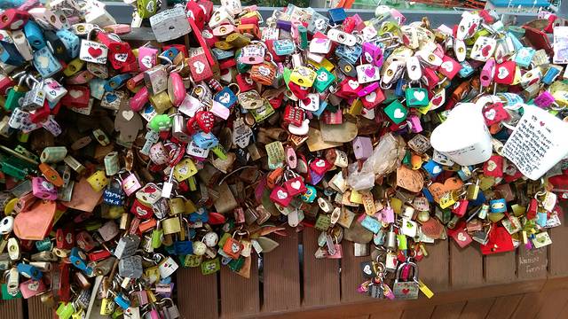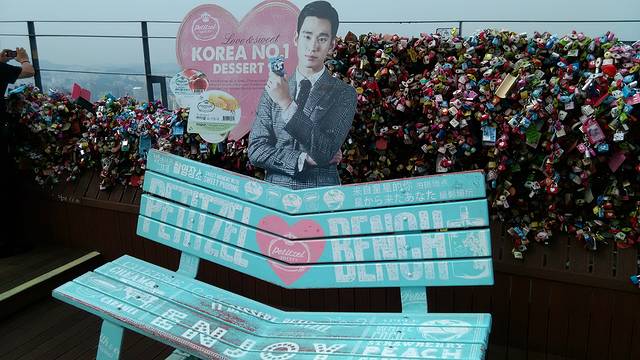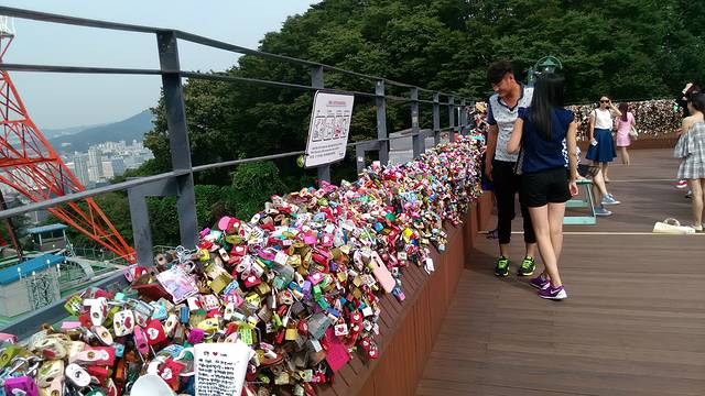 【首尔塔】韩国首尔南山公园,位居海拔265米高的南山公园,山顶耸立着236米的首尔塔,登上高塔可俯瞰首尔中心地区,与生命大厦同为首尔的标志。首尔塔首尔的象征、地标性建筑。同时这里还是热播剧《来自星星的你》取景地。上面有很多情侣的同心锁,一份对爱情的坚固保障。