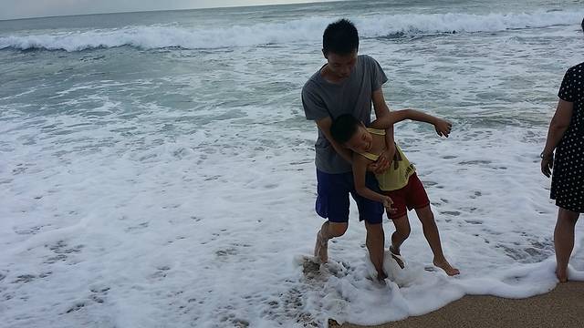 一个大浪过来牛牛全身都打湿了还往岸边冲呢!拽都拽不住,平常没看出他有这勇敢劲儿呀