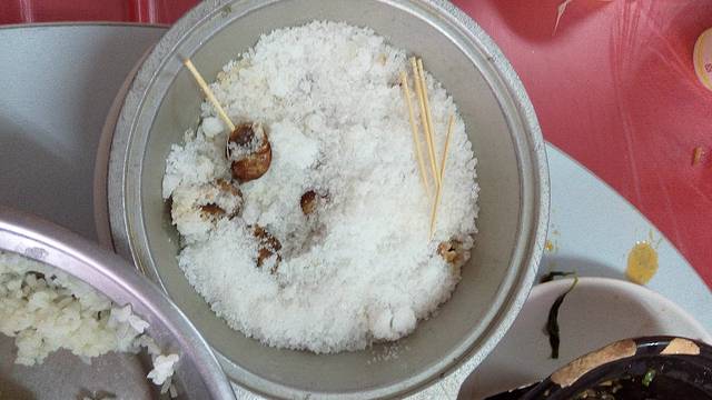 这是哪儿的特色菜来着,盐焗海螺丝,很赞!从大盐粒儿里往外刨着吃