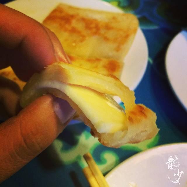 甜奶酪馅饼的味道很惊艳啊,极其好吃,松软的煎饼里夹了一片乳白傲娇的内蒙奶酪,一口下去,奶香四溢,甜丝丝,好吃!