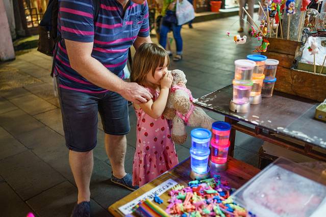 杭州有不少外国人士。这位小箩莉央求爸爸买玩具。