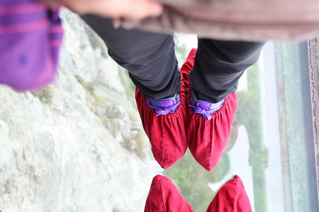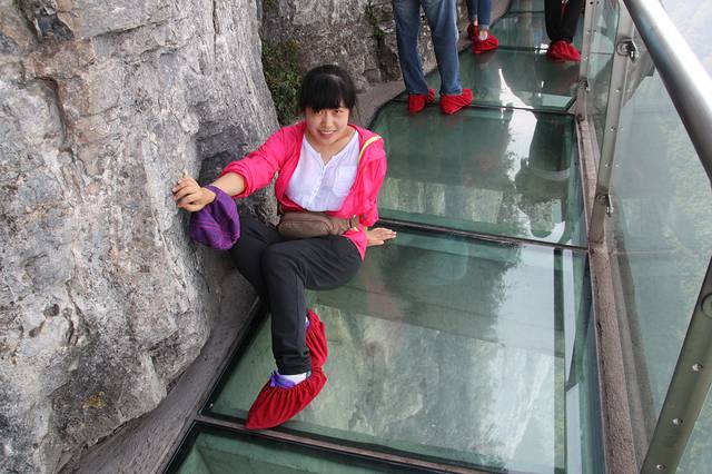 玻璃栈道其实不可怕,因为玻璃已经被磨花了,不够透彻,再有就是人挨着人,没有时间和空间让你害怕,鞋套租赁5元