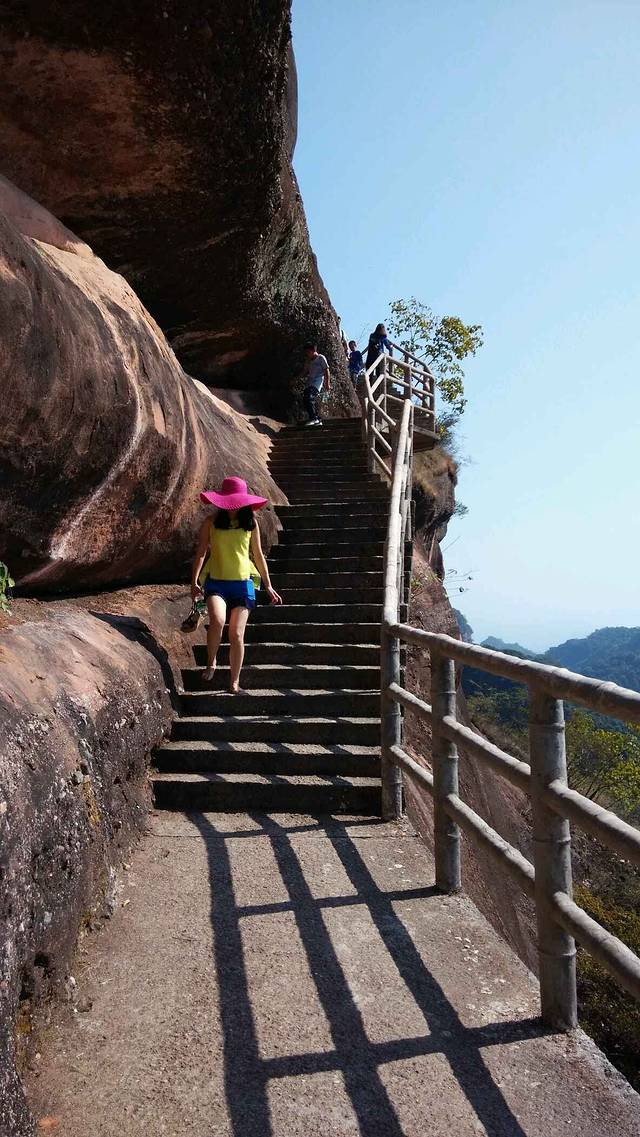 下山去阴元石景区 丹霞栈道还是有点惊险的 我们快到山底的时候脚都发抖了 不过老婆还是很聪明的 打赤脚走下山的 有时候可以听到山对面的吼叫声 老婆也来个大吼 好像没听到回声