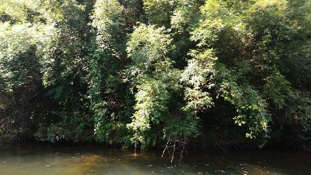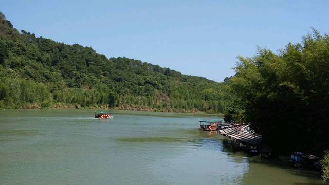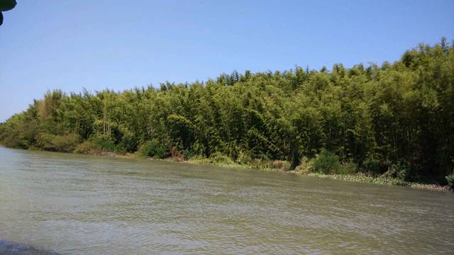 人在画中游 江两岸的竹林倒映在水中 好不美丽