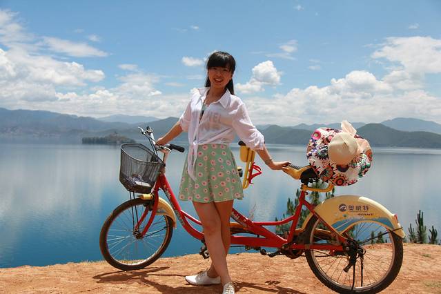 好好的休息一晚以后,又是睡到自然醒。简单吃了点早餐,就准备环湖游泸沽湖了。很多人是租摩托车环湖,我们为了更好的体验泸沽湖的美,租了一辆双人自行车,顺时针方向环湖。泸沽湖一路的景色真心的漂亮,那水蔚蓝蔚蓝,那天与水是一个色,一路上我们走走停停,拍了很多照片,一路上也有很多村落,所以不担心补给的问题。我们是从大落水开始骑车,主要路线是大落水→里格村→里格观景台→尼塞村→里色岛→小落水→卢源崖→大嘴村→凹夸→草海→大落水。骑着单车到大落水基本基本要7个多小时。