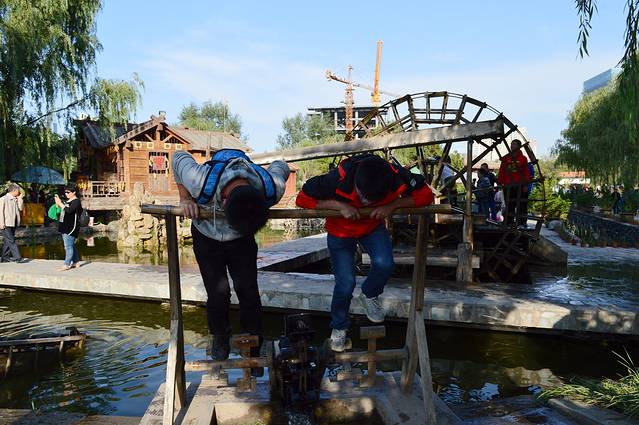 从博物馆出来,直接打车去了水车博览园,这个地方还是很多人来兰州的必看之处,位于滨河路西段,仿照明朝古老水车而建,造型奇特,再现古代黄河沿岸最古老的提灌工具,园内可体验人力驱动的水车,是孩子们的天堂。