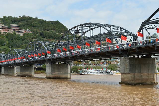沿着滨河路绿色长廊继续前行(步行),没有多久就到了中山桥,关于中山桥也已经有了太多的描述,这里就不多说了,唯一有趣的是正值国庆,因此整座桥上插满了红旗,很是壮观和鲜艳,对的,鲜艳欲滴!在这里我们坐了快艇,快艇有不同价位的,最便宜的10元钱,我们坐了20元的,还行!风不大,天很蓝,快艇很舒服很刺激。