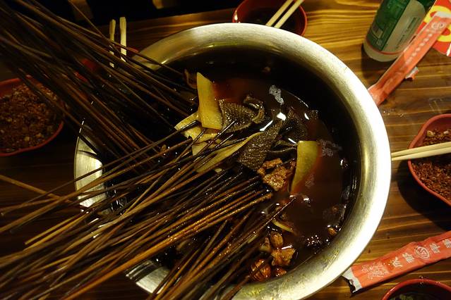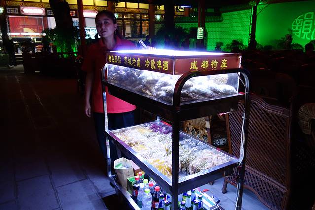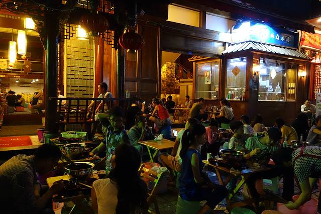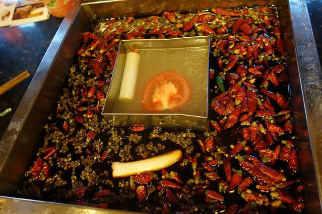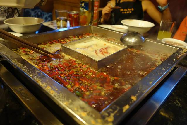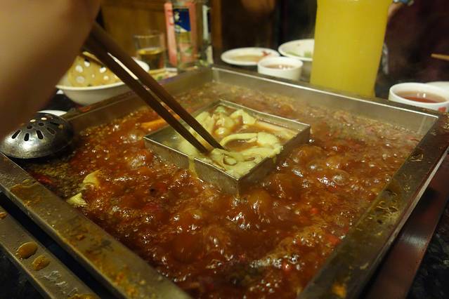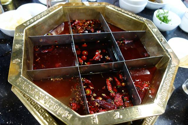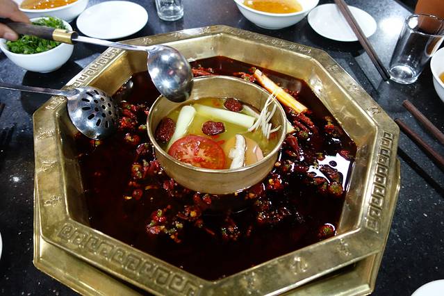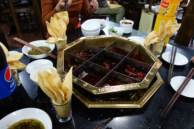 到成都必吃的火锅——古色古香的环境,气派的大铜锅,长长的筷子都特有气氛。麻辣锅不同与传统,白汤在中央,鲜美无比,红汤在外围,够油、够麻、够辣;涮菜中黄喉、毛肚、鹅肠比较经典;小料是香油的,别有风味。服务也不错,会提醒不要多点,蛮贴心。