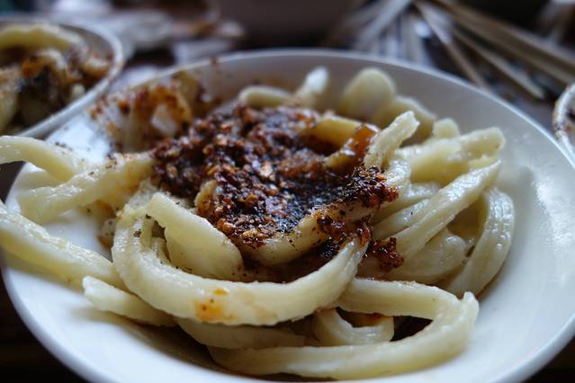 这家就三个词儿:老店、老人、老味道。开了得有十多年了,就算不是吃饭的点,人都满满的。味道始终如一,莫说作为店招的凉粉各有各的味,甜水面也超霸道,韧而不硬的面条裹上酱汁,甜、辣、咸都刚刚好。惹得太婆太爷们N年如一日的凑热闹,要么动作麻利地跟年轻人一起抢位子,要么端一碗坐路边吃,不亦乐乎。