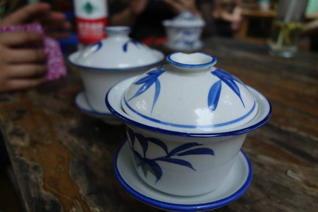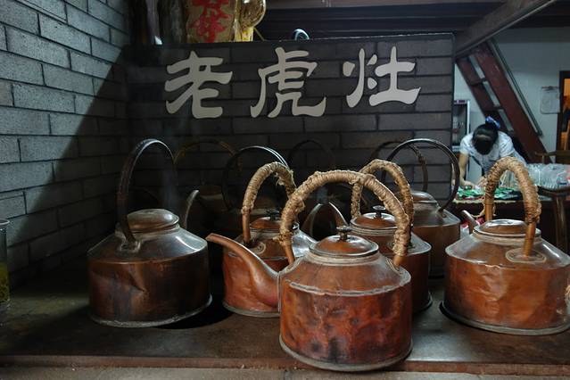 这个茶社年生很久了 烧水的全是铜壶 喝茶的茶器 都是盖碗