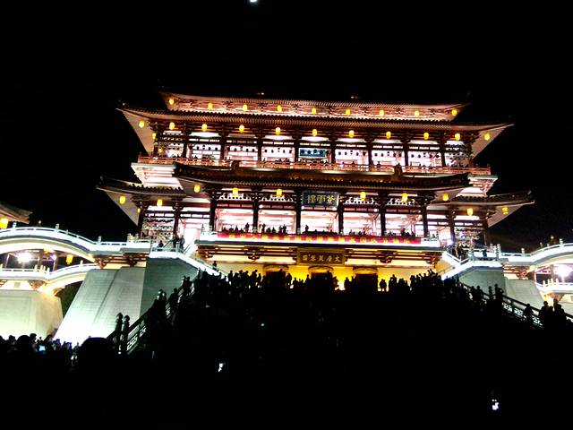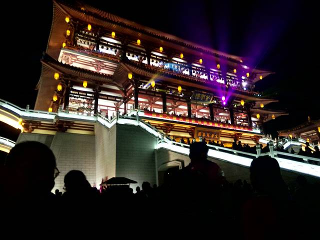 芙蓉园门票60,我是从曲江海洋世界对面的小门进去的,买票人也很少,公园很大,逛了一天体力不支了,走走停停的,最后重头戏去看水幕电影,8点多开始,不到7点就去排队,找地方坐下,这个真是人超级多,而且都向里面挤,有好位置是要票的,最便宜的30,我是免费的,所以就是坐在那里等了一个小时,但是可比等大雁塔喷泉舒服多了。8点多开始有表演,最开始的表演很赞,个人感觉比水幕电影好看。看完之后散场,地上垃圾简直。。。芙蓉园的夜景非常美,真的很值