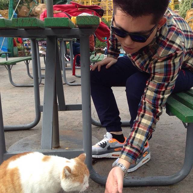 午饭时间到了,蚂蚁王国的欢欢杯旁边的桌椅,解决一下午餐。我和男票自带了很多食物,偶遇一只大黄猫。这只喵胖胖的,但她不是馋猫,因为喂它什么都不吃……