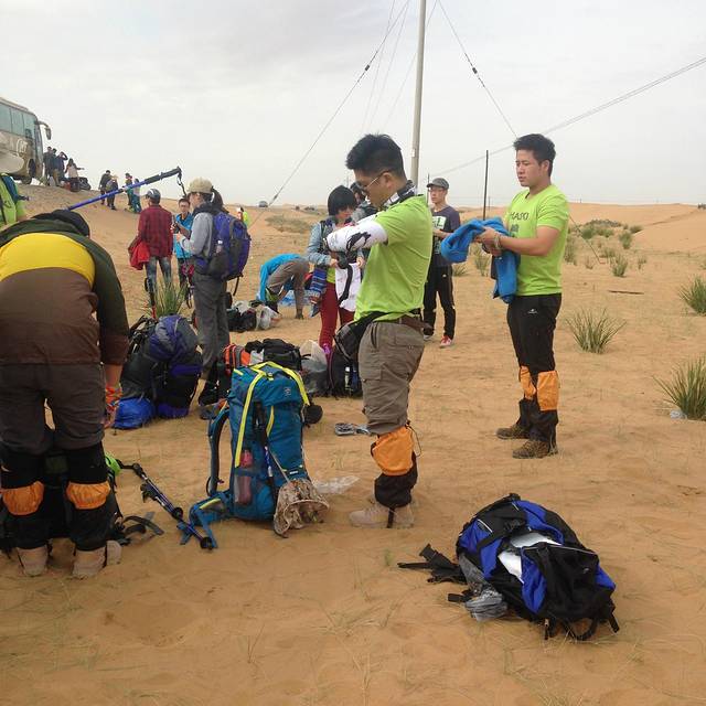 下车后,每个人都在整理行装。穿上雪套、戴上魔术头巾和帽子,备好水和简单的补给食物。初见沙漠,每个人都显得异常兴奋。