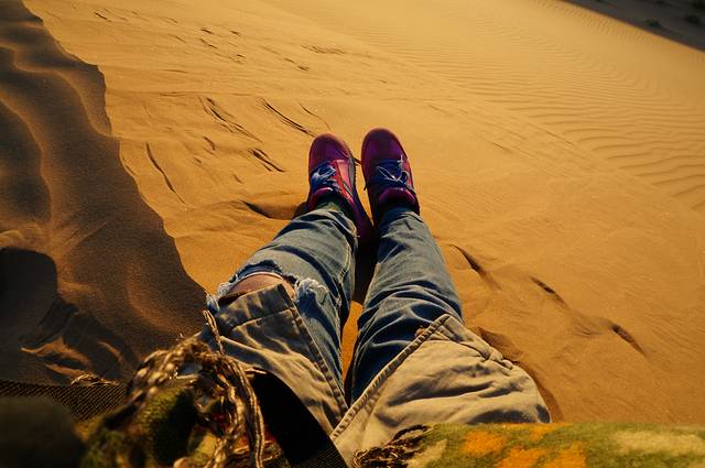 沙漠徒步最最最重要的首先鞋,一双好的登山鞋尤其重要!理由很简单,舒服啊。一般的运动鞋在沙丘上很容易踩滑不稳,而且鞋帮低,进沙。宇哥很二逼的买了一双新的运动鞋呵呵呵呵呵呵,几乎是每走15分钟就要停下来脱鞋倒沙。