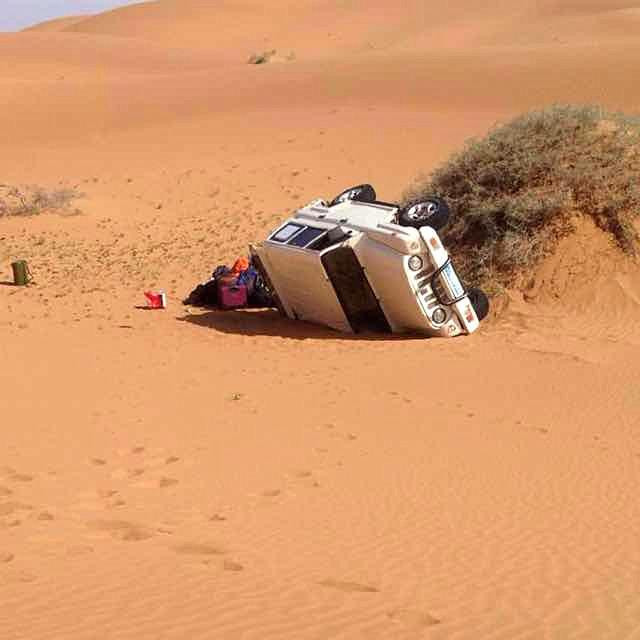 第一天的目的地是太阳湖营地,原本预计下午4-5点抵达。但是中午物资补给车因为翻车迟迟没有抵达,所以40只菜鸟在在沙漠坐了2个多小时等待午饭,结果神马也没等到,最终取消了午餐。一部分不能忍受饥饿或者走不动放弃徒步的驴友等待随行车救援。其余的人忍着继续上路。