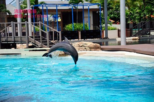 可爱的海豚们在水里随着哨声不时的跃出水面。