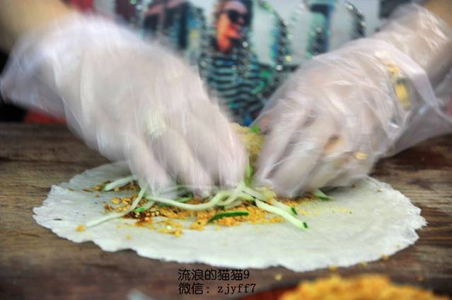 一张薄面皮,涂上各种甜辣酱,铺上黄瓜丝、花生末、脆面包末,以及啥独家配置的米面,卷起来切成一段段的,是老底子新加坡老人的早茶点心。在牛车水的珍珠大厦一楼有卖。