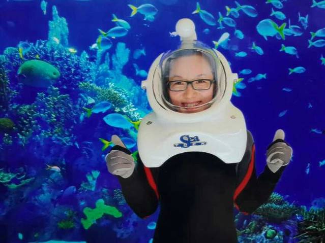 再转头看看小伙伴们,也都戴着硕大的头盔,像一群太空战士一样,在水里咧着嘴看着鱼儿傻笑。