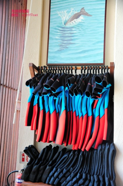 我费了九牛二虎之力,才穿上潜水服,然后穿上水鞋和手套。(潜水服如果不好穿,先湿湿身就会比较容易,水鞋和手套都要注意套在潜水服的外面)