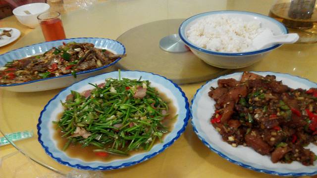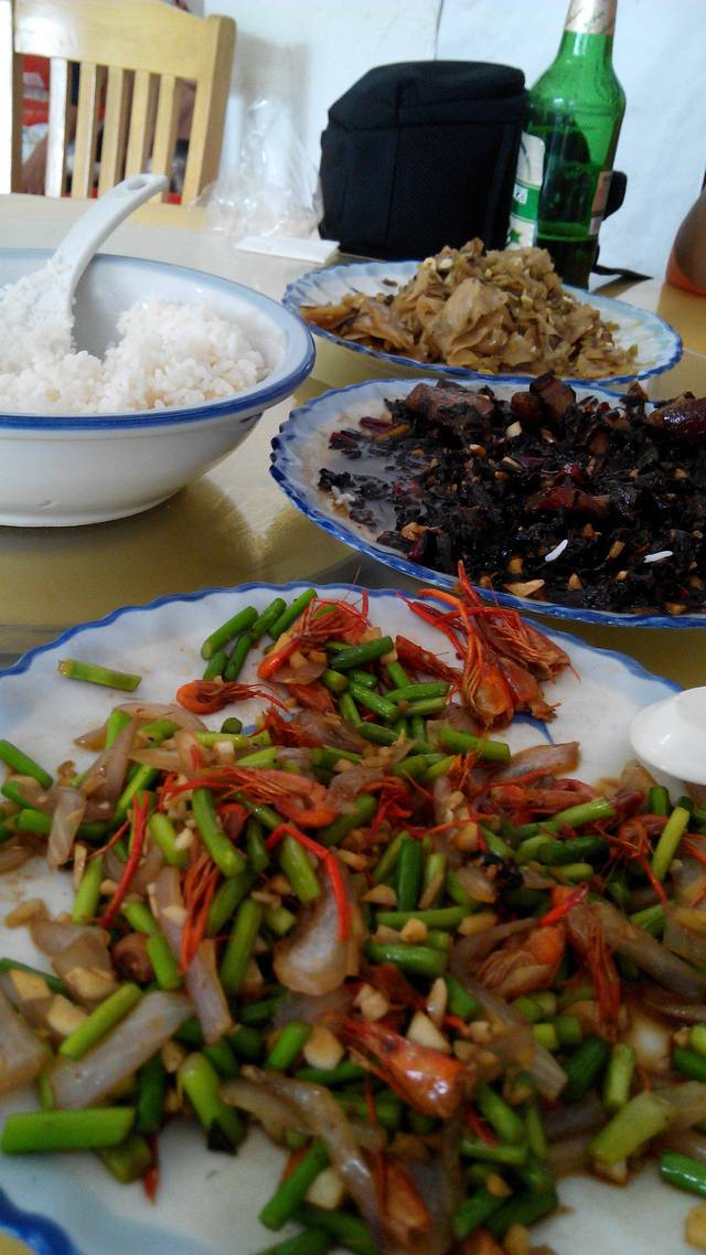 炒碱水粑、梅干菜烧肉、河虾,啤酒一瓶,米饭一盆花费115元。