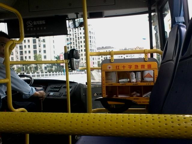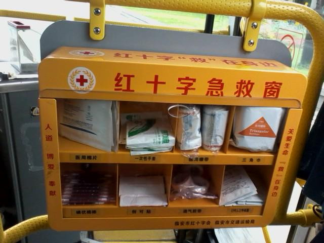 临安的公交车真是先进,应该是在全国,只有这里的公交才配有红十字急救药箱的,里面药品还挺多的,也是在替红十字会做些宣传吧,不管它出于什么目的,只要是好事,就应该赞赞他!