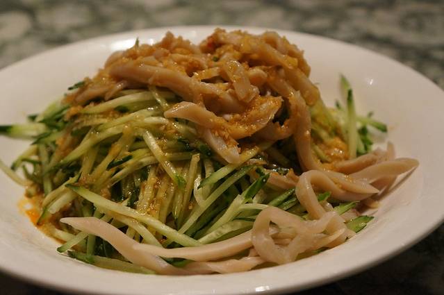 这家饭馆有点国营餐馆的风格,环境一般,服务一般,但因为到店时间早,上菜的速度很快。我们点了葱油鸟贝、糖醋黄花鱼、樱桃肉和三鲜焖子四个菜,好吃程度依顺序递减。大家也许看出了什么问题?两个人吃四道肉菜吃得了么?答案是,吃不了。焖子在我眼里就是块状灌肠沾麻酱,葱油鸟贝非常赞,其他两个菜吃到最后有点腻(果然还是点多了)……