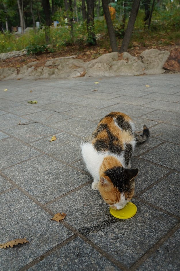 我们一路顺时针走在滨海西路的步行栈道上,实际上按照栈道方向的指示我们应该逆时针从星海广场走到老虎滩,之所以选择顺时针是因为我从大连公交网上查询得知旅游环线这条巴士线路在旅游旺季期从火车站出发沿滨海路顺时针开,这样一来如果我们走路走累了而又打不到黑车的话那么乘坐10元一位的旅游环线大巴就是一个不错的解决方案了。一路上看到很多围着滨海路骑自行车以及跑步的人,我其实来这么多天大连,最羡慕的就是他们的天气,空气质量基本上每天都是优,难怪他们过得悠闲。一路走走停停于11:40到达燕窝岭婚庆广场,正好赶上一对情侣在这里办婚礼,见证了一场大连式的婚礼仪式,沿着公园内的台阶一路下山看到了很多和有趣的雕塑,不过最有趣的是这只野猫,我们坐在一个长椅上吃午餐,这个小家伙在离我们50米外的地方出现,然后一路大摇大摆的走到我们面前喵喵叫摇尾巴,我们家里有只猫,知道这家伙想要什么,于是就把我们手里的肉铺给他吃了点,谁知这家伙竟然吃上瘾了,吃了四分之一片的肉铺!喂了这小家伙这么多口肉后这家伙见我们不喂他了头都不回的大摇大摆就走了,和我们家猫一个德行!