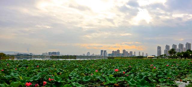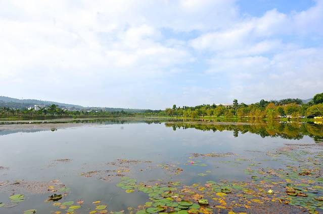 湛蓝的天空和洁白的云朵与湖面交相辉映,湖里还盛开着朵朵莲花,不远处的野鸭在自由自在地徜徉在湖中。