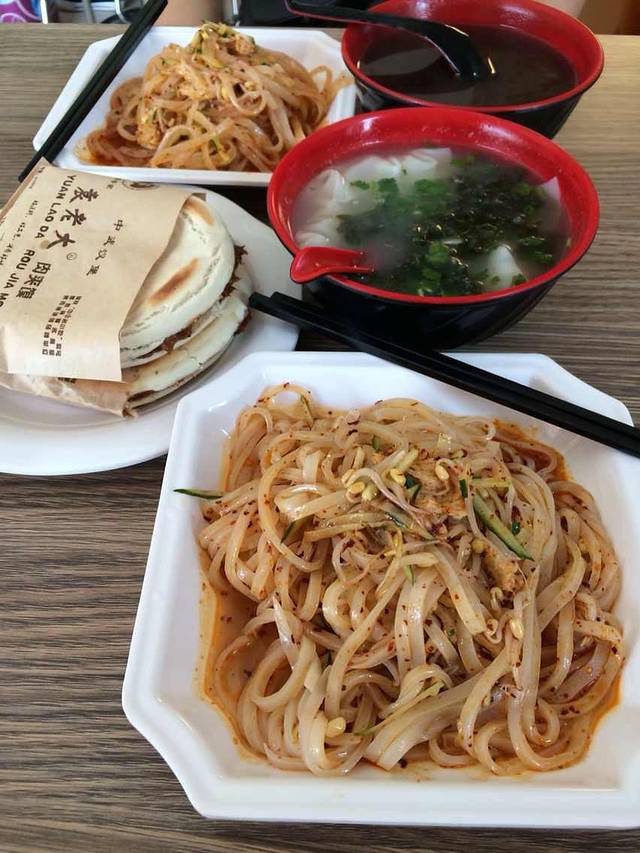 早上8点,我们就起床了,咸阳机场旁边航港城内的边方村里面的袁老大肉夹馍店吃的第一餐,肉夹馍加小混沌还有陕西凉皮~太美味了,肉夹馍里面的卤肉汤汁浓郁、卤肉味浓肉香,嚼劲十足却又不老不硬,馍也刚刚烤出来的(估计是加热的),但是一点也不硬,很好下咽,配上美味的卤肉,很好吃很好吃~。小混沌就不评论了,没有太多的特色;陕西凉皮和其他地方做的味道都不太一样,不知道是麻酱不一样,还是凉皮的做法不一样,很Q很弹,豆芽很大颗,不似贵阳的小绿豆芽,反正就是很大颗的那种绿豆芽,没有什么黄瓜丝啊、胡萝卜丝啊这些配料,但是辣椒也很香,比我想象中的北方食物好多了~,但是,这也是我在西安吃到的,最好吃的一餐了~(哭)