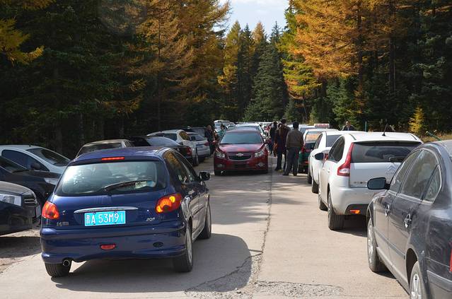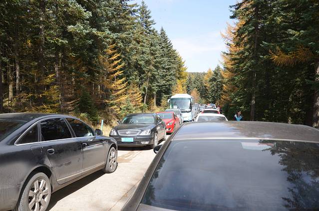 经过情人谷景区,不宽的道路一侧停满了车辆,有些堵塞了,好在有警察维持,一会就通过了。前往芦芽山景区,要翻山梁,全是Z字弯和急坡,离景区有三公里,工作人员就指示不能再往前开了,一侧停满车,另一侧有进有出形成拥堵。我们停好车,步行近一小时才到达景区,走段路到没什么,主要是浪费了我们宝贵的时间,昨天没看成石门悬棺,今天去已经浪费二个多小时了。