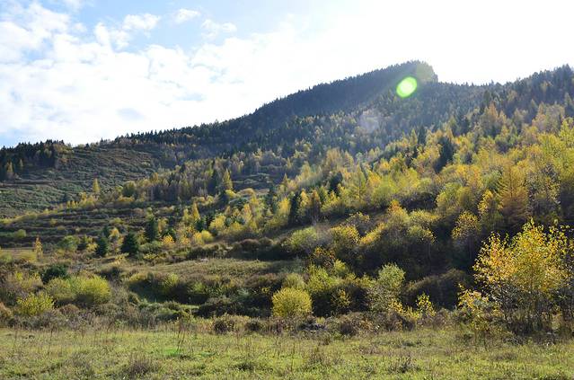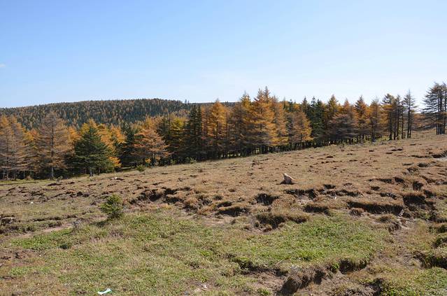 真是奇特,在这样的地形中,一边是茂密的落叶松为主的原始森林,一边是奇峰险峻的芦芽山,能形成这样的一片草原?看来雨水充沛呀,但今年西部地区普遍干旱,这里的草长得也不是太旺盛。广阔的高山草甸,伸向蓝天,天地相接,我们也顺势走向蓝天。