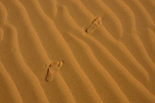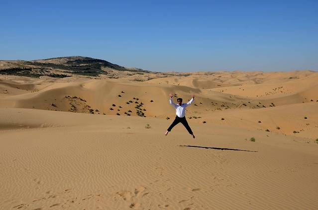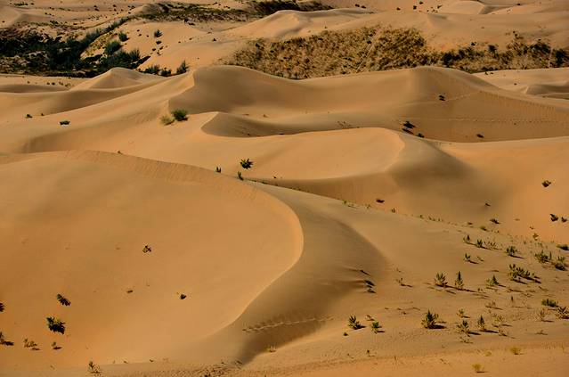 脱掉鞋袜,踩在细细的沙子中,热乎乎的,深一脚浅一脚的爬在一个个沙丘沙沟中,体验这份独有的快乐,深入到游人没有留下踪迹的地方,广阔的大漠,真美!
