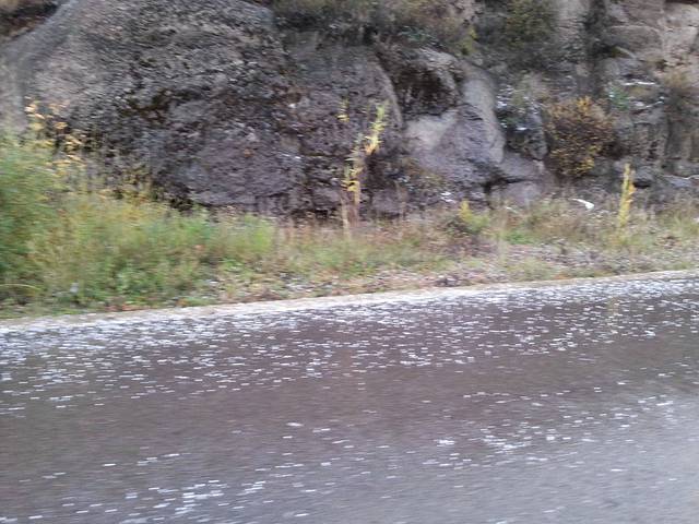 前面是什么?一地白茫茫的,啊,雪,冰雹,真是哟!看来是昨晚上下的,现在可是大晴天哟!