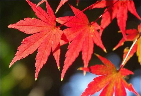 最佳观赏期:进入11月,不同种类的槭树树叶将由橙变红,如火焰般烂漫,令人迷醉。只要仔细观察即可发现,常见槭树种类中,秋叶红艳的有鸡爪槭、三角枫、五角枫;秋叶黄色的有梓叶槭、元宝槭等;有些品种如红枫叶色常年红色或紫红色,艳丽夺目。