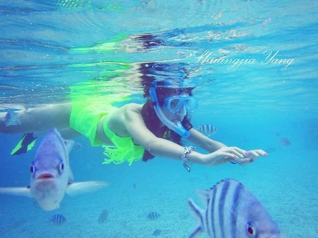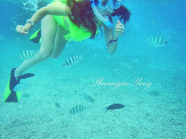 要么不出片,出就出大片,就得本着宁缺毋滥的原则,才对得起广大粉丝们对我的厚爱!哦耶! 喜喜很悲催,从未浮潜过,事迹追溯到从前,去个巴厘岛,赶上大姨妈;去个薄荷岛,又是大姨妈。。。我说大姨妈,为啥每次都是你坏我好事!这次好了,姐长大了,不再那么单纯幼稚不会选日子,姐特意选了好日子,再见,姨妈!你好,鱼鱼!