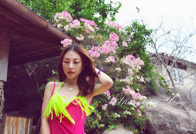 这是还没湿身前呢,暂时还有飘逸秀发,待会儿就是落汤鸡甩鸡毛~背后那小房儿是厕所,如厕回来发现背后门口小花儿不错诶~
